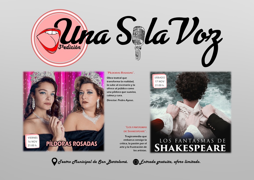 El Ayuntamiento de San Bartolomé por tercer año consecutivo llega con una apuesta cultural en la que el teatro es nexo de contenidos y de voz de grandes expresiones. Dos obras teatrales Píldoras Rosadas y los Fantasmas de Shakespeare se representarán este fin de semana en el municipio con entrada gratuita y aforo limitado, el viernes 16 y sábado 17 de noviembre, a las 21.00 horas en el Teatro de San Bartolomé.