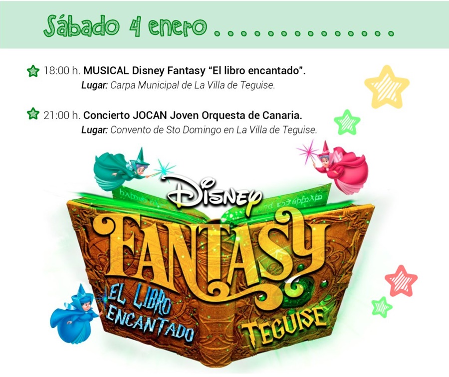 Tal y como indican desde el Ayuntamiento, el tradicional Musical de Navidad de Teguise volverá a recuperar las bandas sonoras, personajes y coreografías de Disney Fantasy "El Libro Encantado" y llenará la Carpa Municipal de La Villa en las dos funciones programadas: la primera, el sábado a las 18.00 horas, y la segunda, el domingo a las 17.30.