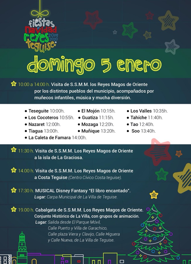 La Navidad toca a su fin y en Teguise va a despedirse con la celebración de varios espectáculos que llenarán de emociones e ilusión, sobre todo, a los más pequeños. El Musical de Disney, que vendió en tres días las 1.400 localidades disponibles a través de la plataforma online habilitada por el Ayuntamiento, junto a la Cabalgata de los Reyes Magos, son los eventos más esperados por los niños y las niñas del municipio.
