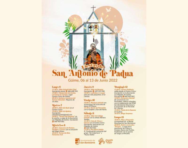 El alcalde de San Bartolomé, Isidro Pérez, informa a toda la vecindad que desde el día 6 y hasta el 13 de junio, se celebrarán los festejos de San Antonio de Padua en la localidad de Güime, deseándoles unos felices días en los que disfrutar y compartir en comunidad, agradeciendo la labor que realiza la concejalía de Festejos, que dirige Estefanía Luzardo, y a todas las personas que, como en cada edición, se vuelcan para que la vecindad disfrute de un programa de actos para todos los públicos. Gracias por la gran implicación y trabajo.