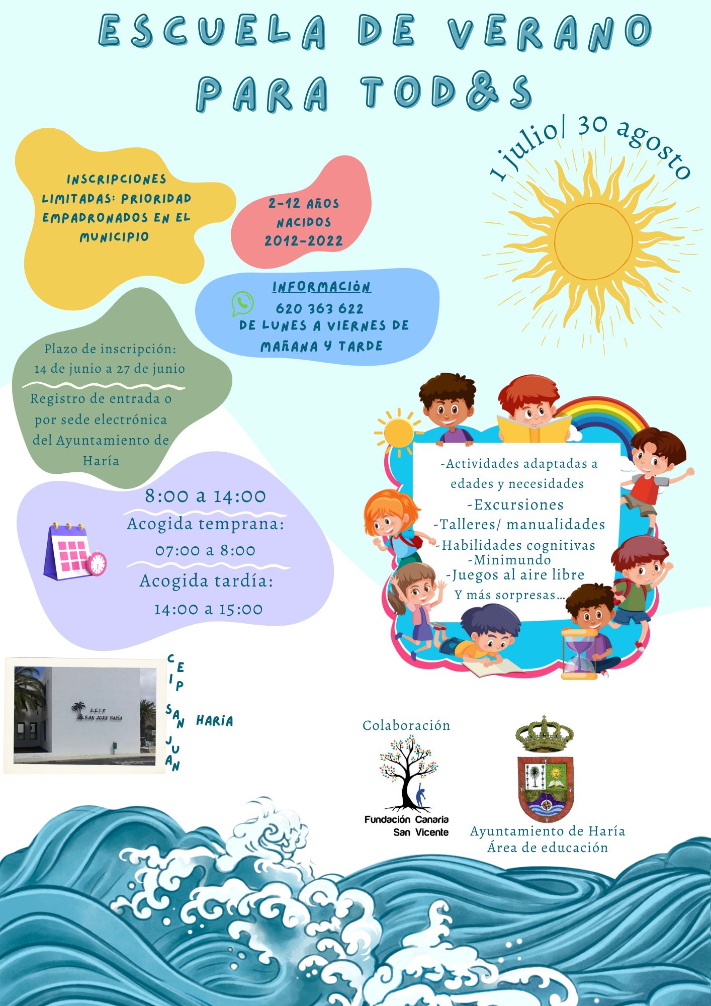 El Ayuntamiento de Haría, en colaboración con la Fundación Canaria San Vicente, abre el plazo de inscripción para la Escuela de Verano para Tod&s, que permanecerá abierta hasta el jueves 27 de junio.