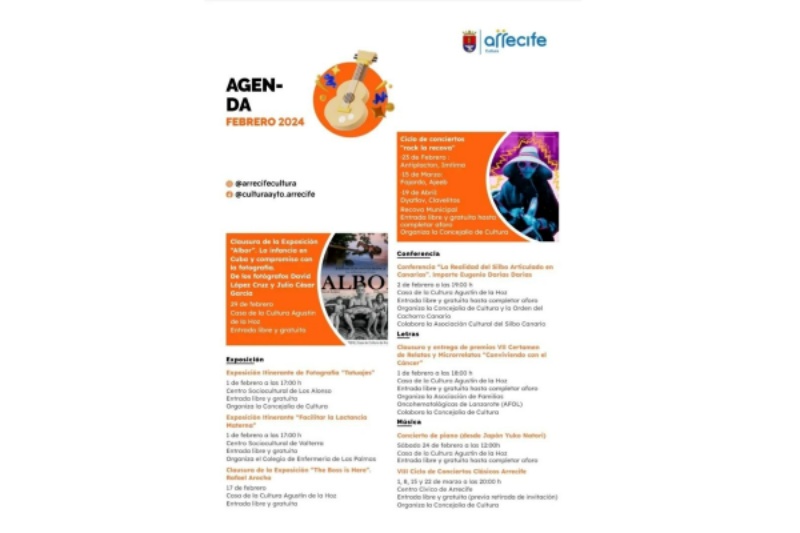 Además, la agenda cultural de Arrecife de febrero incluye la conferencia 'La realidad del silbo articulado en Canarias', organizada por el Orden del Cachorro Canario, que impartirá este viernes el investigador Eugenio Darias a partir de las 19 horas en la Casa de la Cultura Agustín de la Hoz.