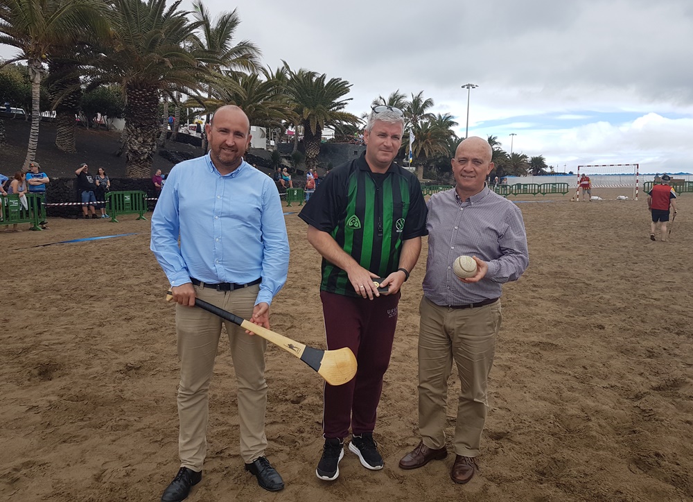 El alcalde de Tías, Pancho Hernández, y el teniente de alcalde y concejal de Turismo, Amado Jesús Vizcaíno, presenciaron esta mañana estos encuentros y participaron en sus respectivos saques de honor de este deporte de equipo (de origen celta, regido por la Asociación Atlética Gaélica, donde se juega con palos "hurl/camáin" con los que se golpea una pelota "slither").