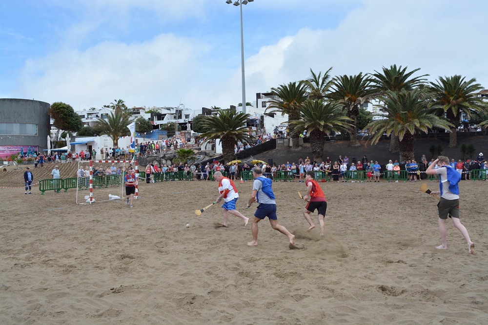 La playa grande de Puerto del Carmen se ha convertido este jueves en un campo para la disputa del deporte estrella en Irlanda, el hurling. El tradicional césped de la isla del trébol ha cambiado hasta el jable conejero para un encuentro con 'las pelotas más veloces del mundo'. El hurling se juega con palos a los que se golpea a una pelota. Muchos de los turistas irlandeses que están disfrutando de sus vacaciones en Lanzarote se dieron cita hoy en Playa Grande para presenciar estos encuentros.
