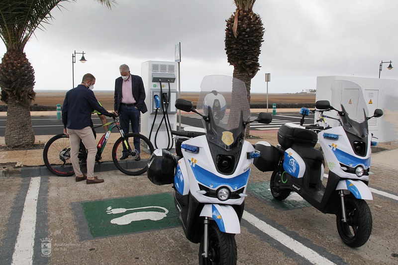 El Ayuntamiento de Tías ha presentado los dos nuevos puntos de recarga para vehículos eléctricos instalados en la Avenida de las Playas, por la zona de Los Pocillos, y en la Avenida Juan Carlos I de Puerto del Carmen. También se presentaron dos motos eléctricas y 4 bicicletas eléctricas.