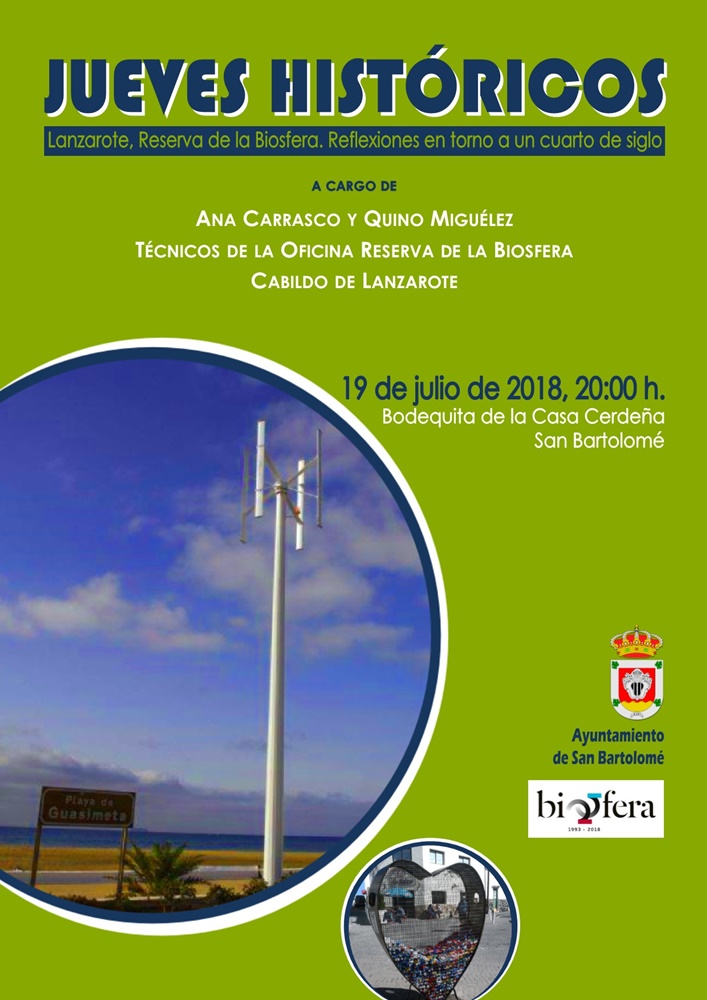 El jueves, día 19 de julio, dentro de los "Jueves Históricos", organizados por la concejalía de patrimonio del Ayuntamiento de San Bartolomé delegada en María Dolores Fernández, a las 20.00 horas se celebrará en la Casa Cerdeña la charla "Lanzarote. Reserva de la Biosfera, Reflexiones en torno a un cuarto de siglo" a cargo de Ana Carrasco y Quino Miguélez, técnicos de la Oficina Reserva de la Biosfera del Cabildo de Lanzarote.