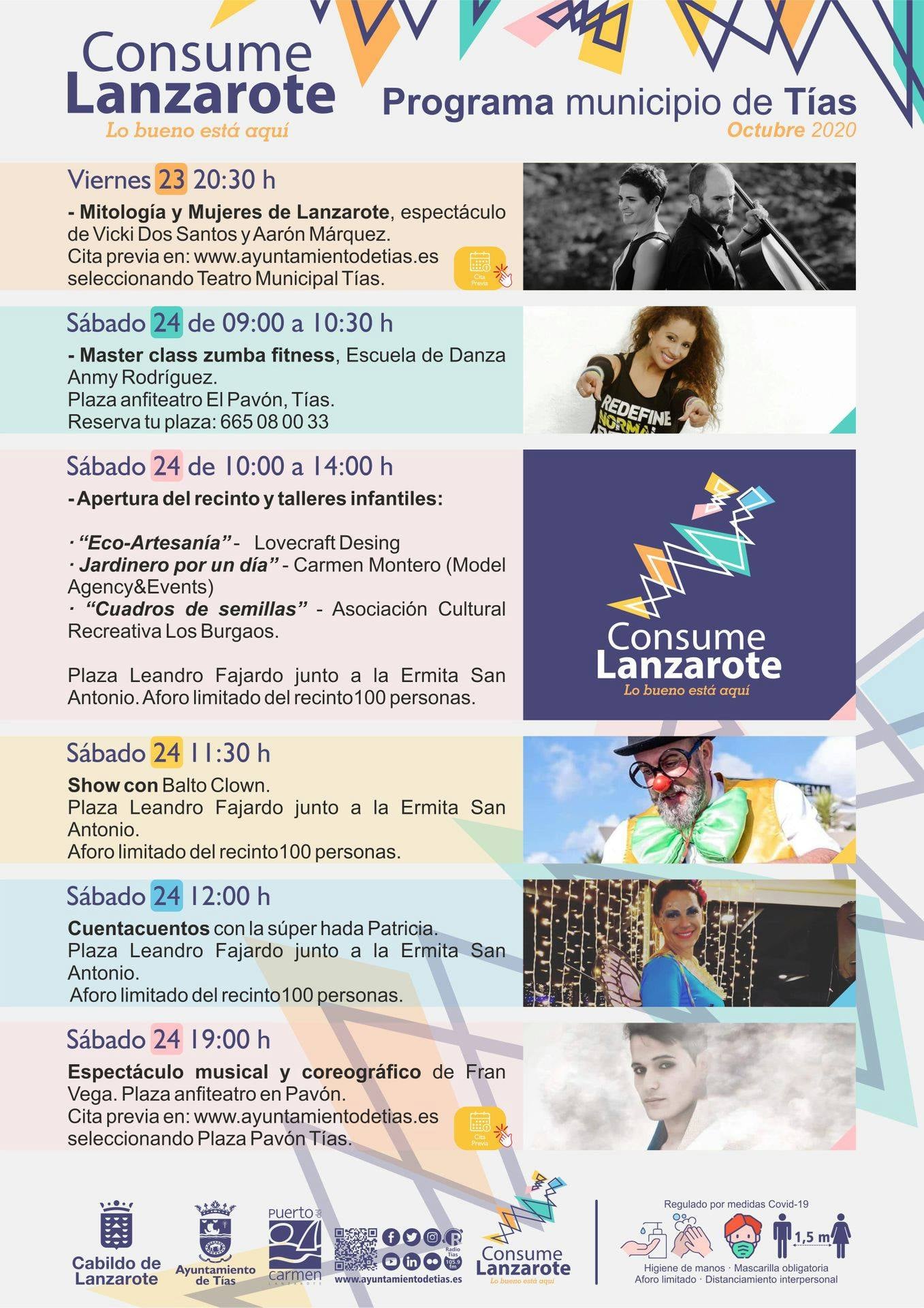 También habrá casetas fomentando el reciclaje con el proyecto "Tías CUÍDAME" y de apoyo al club de fútbol Sporting Tías en su campaña solidaria de mascarillas para niños y niñas del municipio. Estarán presentes proyectos tan interesantes como Re+flota, huertos comunitarios y la asociación Chrysallis. Para las 11:30 horas está prevista la actuación de Balto Clown, espectáculo destinado al público infantil, y para las 12:00 horas, una sesión de cuentacuentos a cargo de la Super Hada Patricia. El coreógrafo Fran Vega actuará a las 19 horas.