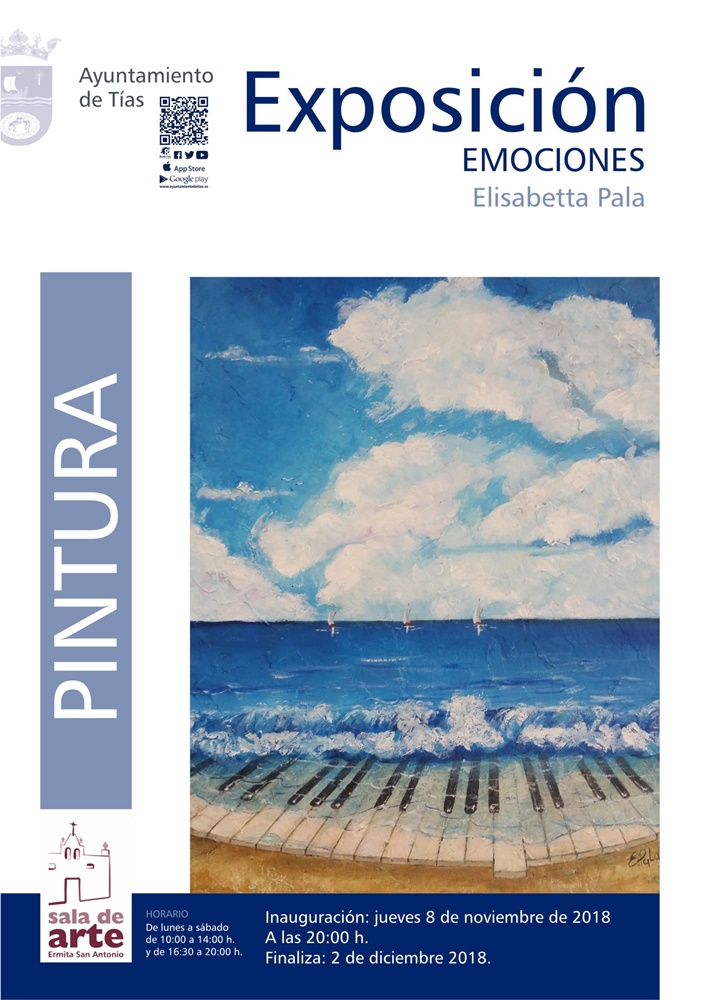 La sala de exposiciones La Ermita de San Antonio, en Tías, acogerá este jueves da las 20 horas, la Exposición de pinturas "Emociones", de la artista Elisabetta Pala, natural de Módena, Italia. Esta exposición permanecerá hasta el próximo 1 de diciembre y podrá ser vitada en horario de lunes a sábado de 10:0 a 14:00 horas y de 16:30 a 20:00 horas.