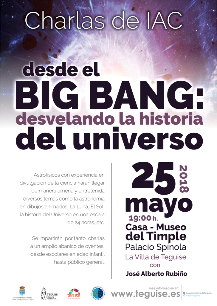 Sobre todo ello versará la ponencia "Desde el Big Bang: desvelando la historia del universo", que se impartirá este viernes, 25 de mayo, a las 19.00 horas, en la Casa-Museo del Timple de La Villa de Teguise, y que forma parte del ciclo de charlas que el IAC ofrece en la Real Villa de Teguise con motivo de sus 600 años de historia.