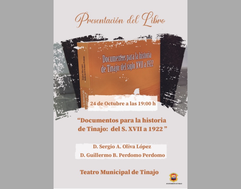 El Teatro Municipal acogerá, el próximo 24 de octubre, a las 19.00, la presentación del libro “Documentos para la historia de Tinajo: del siglo XVII a 1922”, elaborado por Sergio Oliva y Guillermo Perdomo. En la obra menciona a cada uno de los vecinos que vivieron en el municipio a lo largo de tres siglos. Datos que se conservan y se han podido contrastar en el Archivo Histórico Provincial de Las Palmas de Gran Canaria y en el primer libro de casamientos de la parroquia, que comenzó en el siglo XVI.