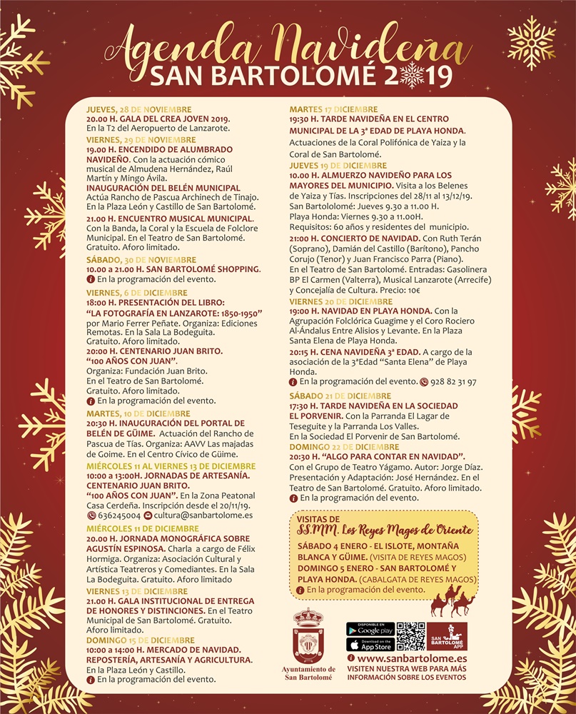 Actividad: Almuerzo Navideño para los mayores del municipio. Visitando los Belenes de Yaiza y Tías. Inscripciones del 28 de noviembre al 13 de diciembre de 2019 (San Bartololomé: jueves de 9.30 a 11.00 horas. Casa Ajei y Playa Honda: viernes de 9.30 a 11.00 horas. Oficinas Municipales). Requisitos: 60 años y residentes en el municipio.