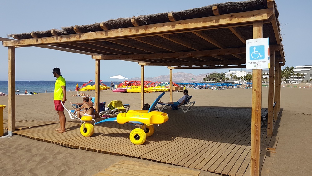 El Ayuntamiento de Tías ha planificado que todos los servicios para personas con discapacidad o movilidad reducida se centren en la zona nº 5 de Playa Grande donde se han dotado de nuevas rampas 100 X 100 accesibles, los baños adaptados, ducha adaptada ( con silla suspendida), rampillas de madera para acceder a la playa y una zona de solárium cubierta para sus exposiciones al sol.