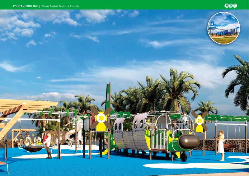 Avanza que el proyecto incluye un diseño con temática aeronáutica, con un avión y una torre de control de 6 metros de altura con tobogán, circuito de equilibrio, tirolina de 20 metros, colchonetas trampolín sobre pequeñas elevaciones y pérgolas de madera para zonas de sombra.