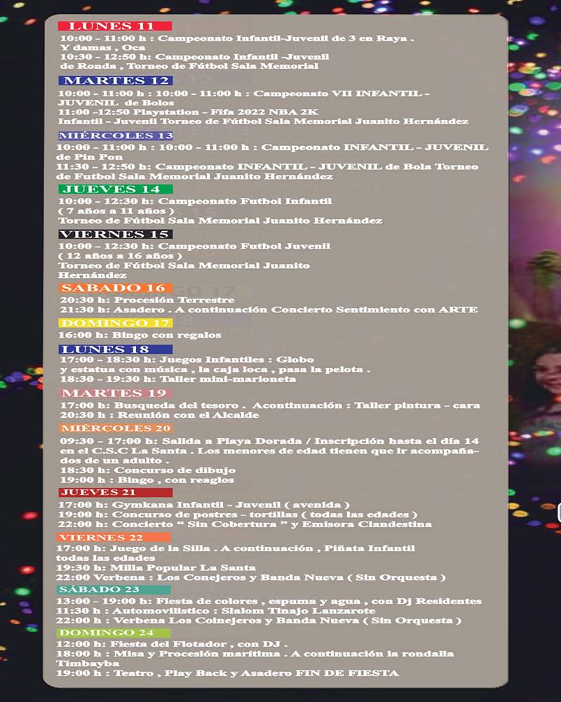 El Ayuntamiento de Tinajo, a través de la Concejalía de Festejos, ha publicado el programa de Fiestas La Santa, que arrancará con sus actividades durante la jornada de hoy y finalizarán el próximo 24 de julio. Un itinerario al completo, con eventos para toda clase de público y para el disfrute familiar.