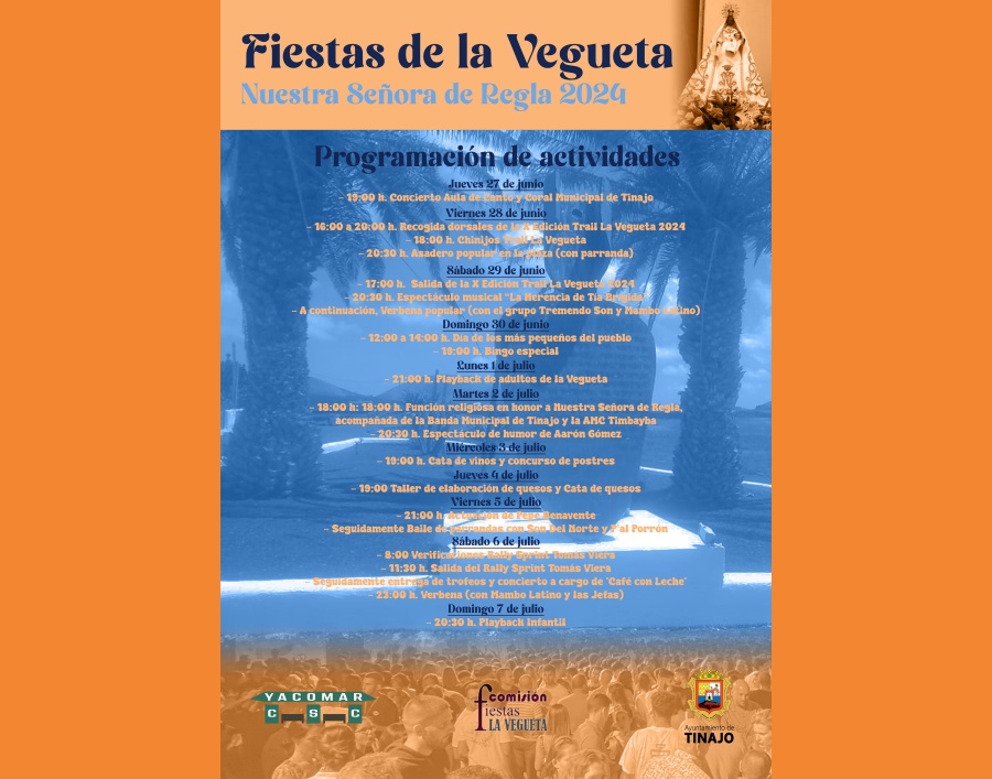 El Ayuntamiento de Tinajo y la Comisión de Fiestas de La Vegueta han hecho pública la programación para la Festividad de Nuestra Señora de Regla 2024 de La Vegueta, repleta de actividades para todos los gustos y edades hasta el 7 de julio.