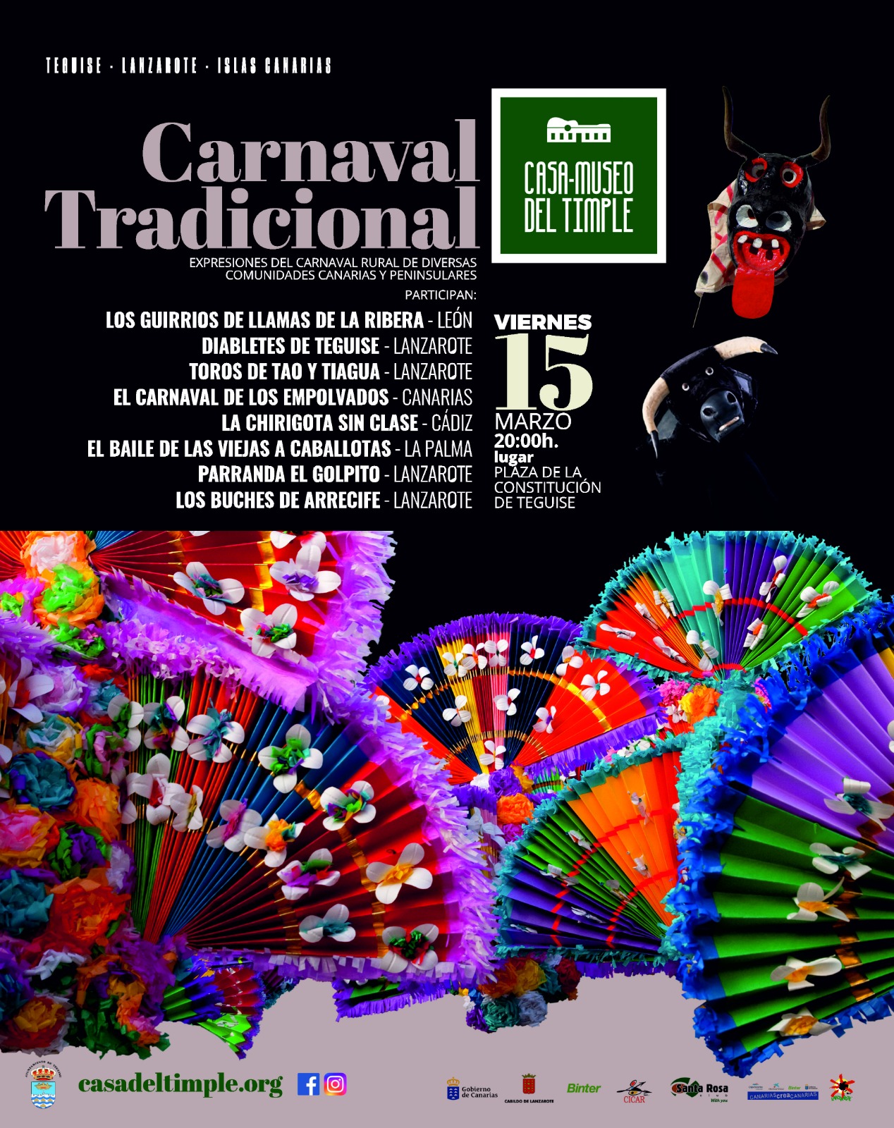 Los Guirrios de Llamas de La Ribera (León), La Chirigota Sin Clase (Cádiz), El Baile de Las Viejas a Caballotas (La Palma) y el Carnaval de Los Empolvados de Canarias, acompañarán hoy a partir de las 20.00 horas, a Los Diabletes de Teguise, a Los Toros de Tao y Tiagua, y a Los Buches de Arrecife, que junto a la Parranda El Golpito ofrecerán un espectáculo de costumbres en el que Teguise vuelve a ser anfitrión con el objetivo de acercar todas estas tradiciones al público en general en el mejor de los ambientes.