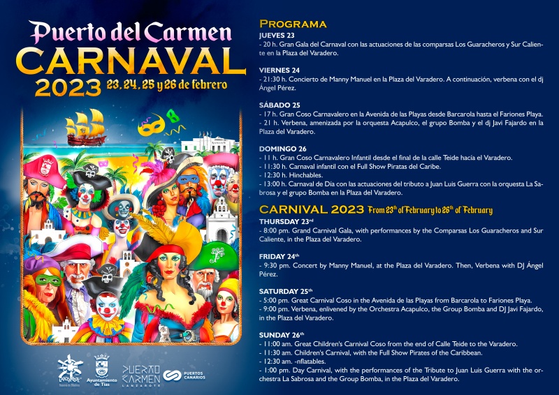 El sábado, 25 de febrero, tendrá lugar, a partir de las 17 horas, el gran coso carnavalero a lo largo de la Avenida de las Playas de Puerto del Carmen, desde la zona de Barcarola hasta la zona Fariones Playa. Para las 21 horas se ha previsto una verbena en la Plaza del Varadero a cargo de la orquesta Malibu Band, el grupo Bomba y el dj Javi Fajardo.