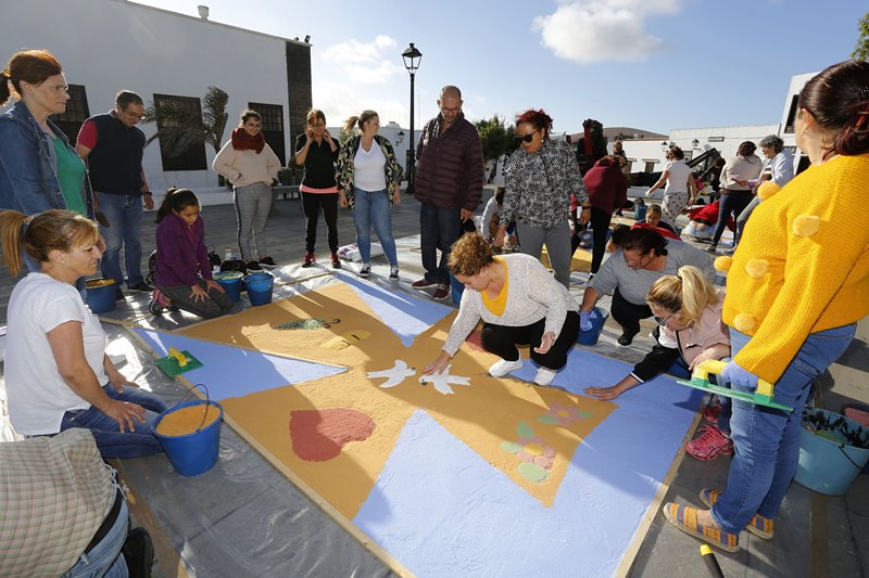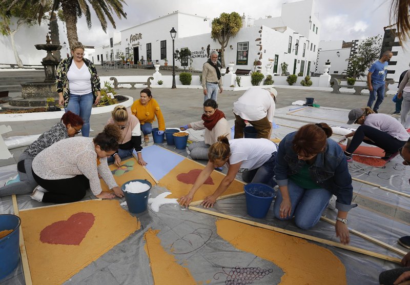 Un año más en La Villa de Teguise se reunieron alrededor de la Plaza de La Constitución de Teguise, popularmente conocido como plaza de Los Leones, vecinos particulares y otros integrados en asociaciones y colectivos para elaborar las tradicionales alfombras de sal, trabajos que se fueron cogiendo forma y color a lo largo de la tarde de este viernes y que desde ya adornan la zona.