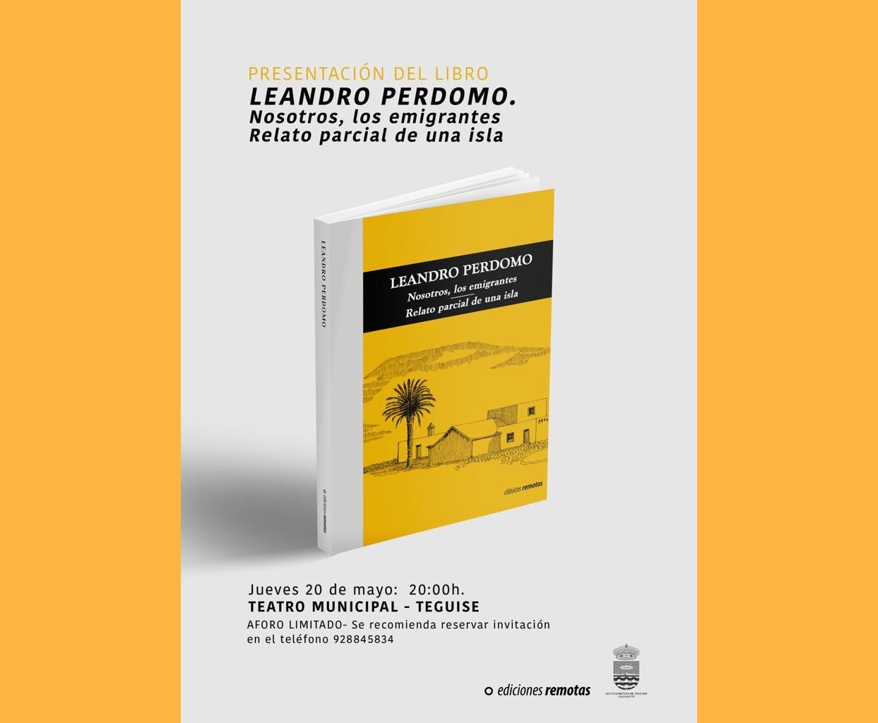 El Teatro Municipal de Teguise de la Villa acogerá este jueves 20 de mayo, a las 20:00 horas, la presentación del libro de "Leandro Perdomo: Nosotros, los emigrantes y Relato parcial de una isla". La obra es un nuevo número "Clásicos remotos", una colección de Ediciones Remotas que pretende rescatar libros relevantes del patrimonio literario, pero que han sido descatalogados o están parcialmente olvidados, y que en esta ocasión se dedica a dos textos del escritor lanzaroteño Leandro Perdomo (1921-1993), de quien se está celebrando el centenario de su nacimiento.