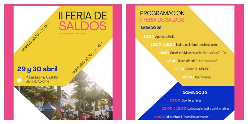 El Ayuntamiento de San Bartolomé pone en conocimiento de las vecinas y vecinos del municipio que los próximos días sábado, 29 de abril, de 10:00 a 20:00 horas, y domingo, 30 de abril, de 10:00 a 15:00 horas, se celebrará en la Plaza León y Castillo la segunda edición de la Feria de Saldos y Oportunidades.