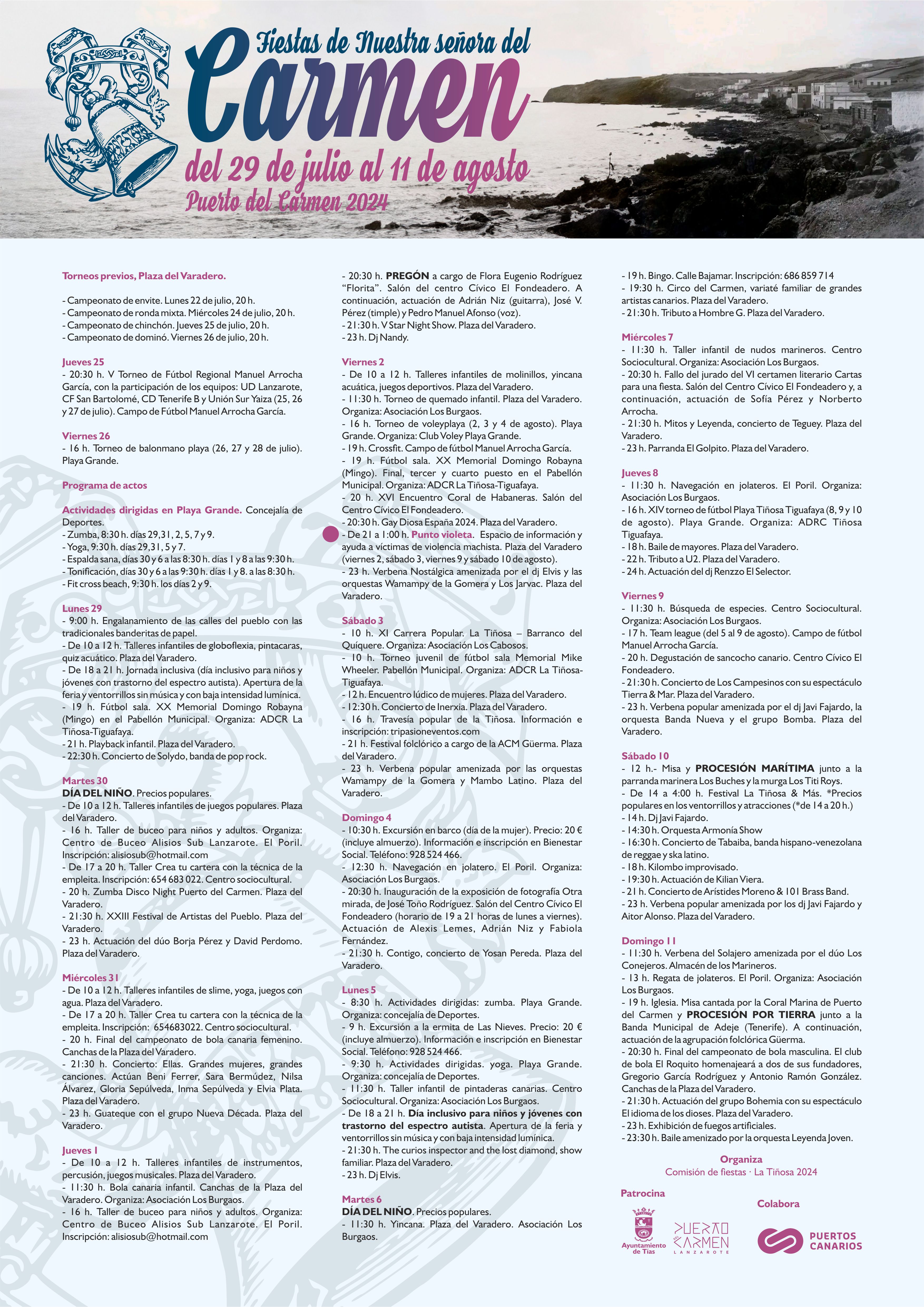 Además del Día Inclusivo el lunes 5, la instalación del Punto Violeta los fines de semana, el exitoso Festival de Artistas del Pueblo de esta noche y el espectacular concierto Ellas. Grandes Mujeres de mañana, se debe hacer mención a la lectura del pregón, el jueves a las 20:30 horas en El Fondeadero, a cargo de Flora Eugenio Rodríguez "Florita".