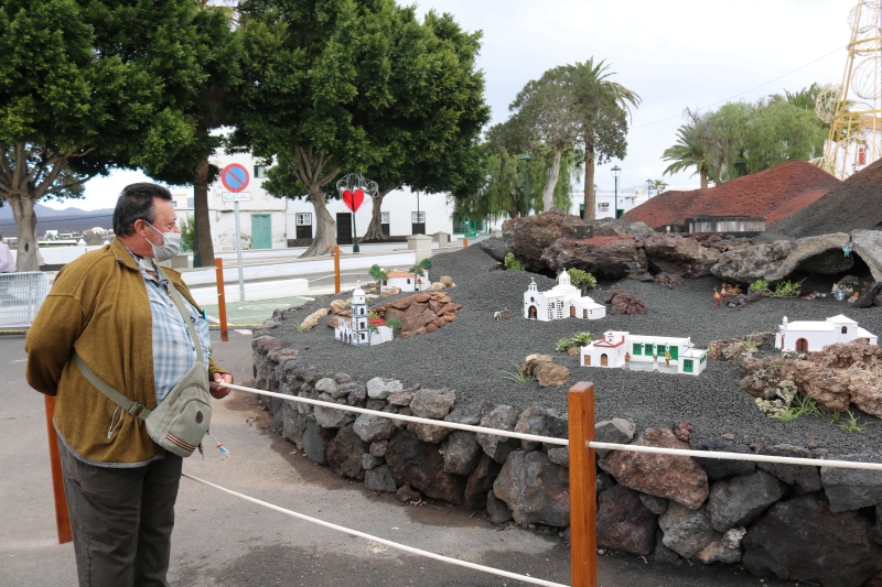 Lugares emblemáticos de Yaiza como las Montañas del Fuego, Salinas de Janubio, La Geria y el Charco de los Clicos no faltan tampoco este año, así como representación de todos los municipios de la Isla a través de sus características ermitas e iglesias, todo ello en una exposición circular que abarca una extensión de 120 metros cuadrados.
