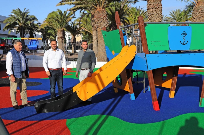 El alcalde de Arrecife, Yonathan de León, acompañado por el vicepresidente y consejero de Obras Públicas, Jacobo Medina, y el concejal de Parques y Jardines, Roberto Herbón, han visitado el barrio de Altavista, donde el Ayuntamiento ha concluido los trabajos de renovación de este parque infantil, con un plan puesto en marcha en otoño pasado.