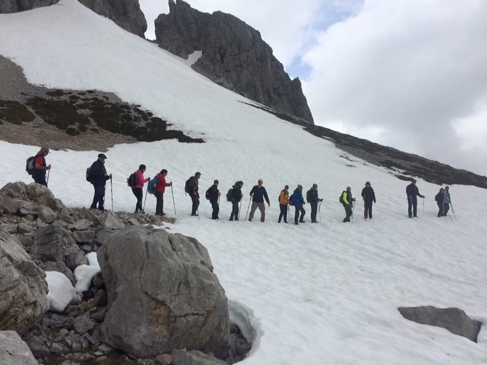 Senderismo por los Picos de Europa, en su parte Cántabra, fue la ruta elegida para el cuarto día. Subida en el teleférico hasta la parte superior, en la bajada el grupo encontró nieve acompañándoles una climatología muy buena a pesar de que es una zona de alta montaña.