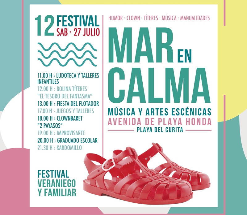 La playa y la avenida de Playa Honda serán protagonistas este sábado 27 de julio de la propuesta cultural estival de artes escénicas y música “Festival Mar en Calma 2019”. Una variada y atractiva programación que inundará esta localidad residencial de San Bartolomé, destinada a todos los públicos, y pensada para las familias y su disfrute conjunto, sobre todo en la programación de mañana y primeras horas de la tarde, en este duodécimo aniversario del Festival Mar en Calma, que se celebrará en la avenida y playa, zona de Juan Curita.