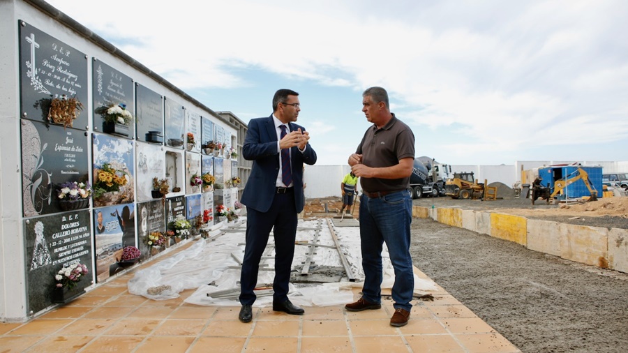 El alcalde de Teguise, Oswaldo Betancort, ha visitado las obras de ampliación del Cementerio Municipal de La Villa Nuestra Señora de Las Nieves, en el que se está llevando a cabo la construcción de 188 nichos y 45 columbarios.