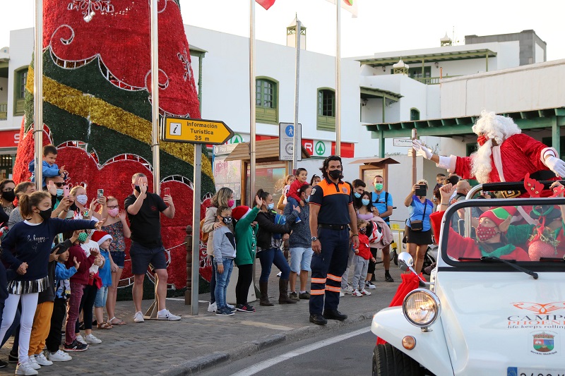 Un exultante Papá Noel, con mascarilla navideña, ha recorrido esta tarde las principales calles de Playa Blanca repartiendo alegría y buen humor en compañía de sus elfos para que los más pequeños del municipio pudieran verle pasar y cerciorase así de que, a pesar de la pandemia, esta noche acudirá a sus casas como cada año para dejar alguna sorpresita a aquellos que se han portado bien.