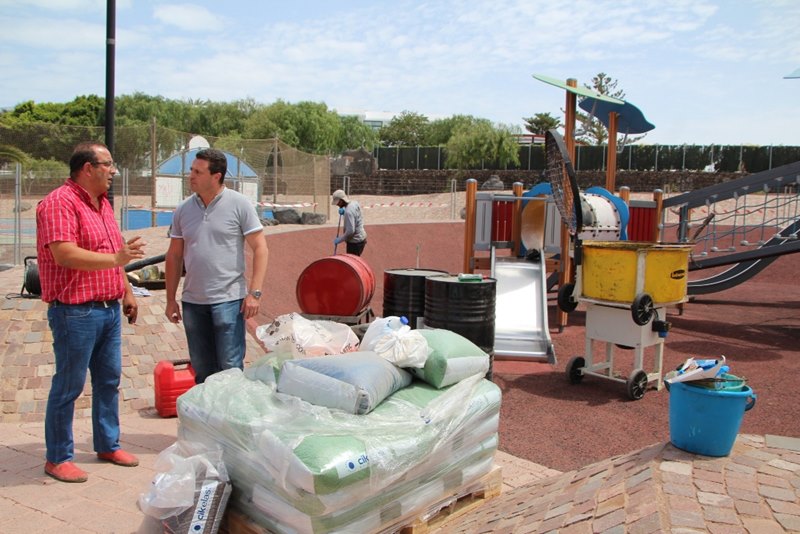 El Ayuntamiento de Yaiza finaliza la instalación de un nuevo pavimento de caucho en el área de juego infantil del Parque del Mediterráneo de Playa Blanca invirtiendo 8.000 euros, así lo confirmó el concejal responsable del Área, Rubén Arca, que visitó la zona de actuación junto al alcalde, Óscar Noda.