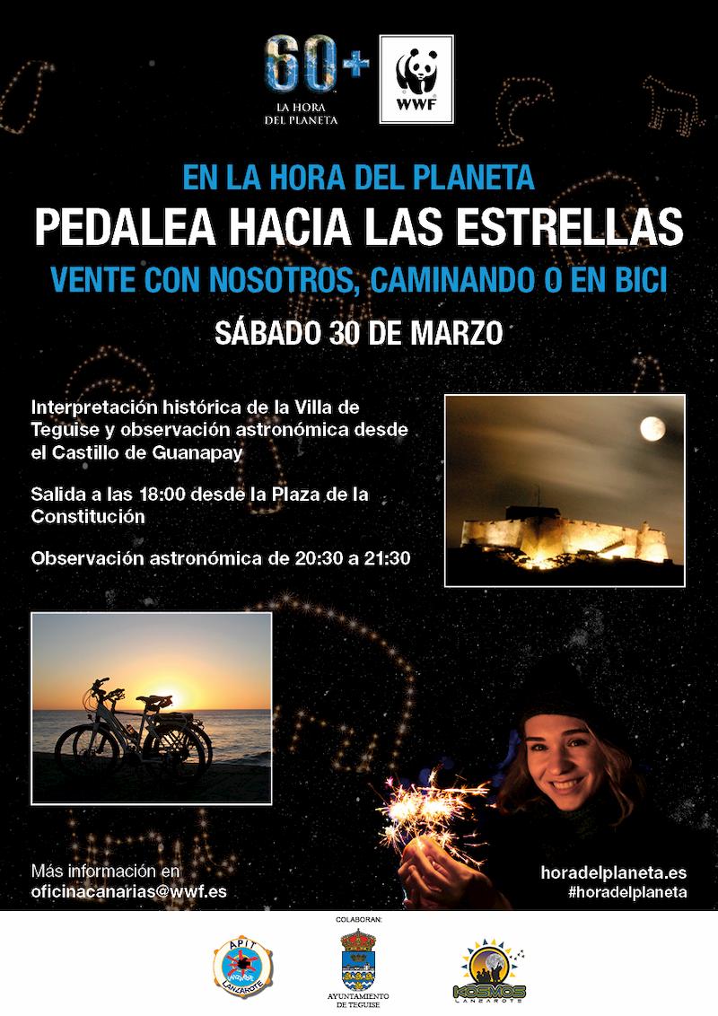 El Ayuntamiento de Teguise todos los años colabora con esta iniciativa apagando las luces de la fortaleza de Santa Bárbara, pero este año además, plantea hacer una marcha con un final muy especial. Desde la Plaza de La Constitución del pueblo de la Villa se saldrá en bicicleta a las 18 horas, aunque también se puede optar por ir a pie, con interpretación del Conjunto Histórico incluida, y con destino final en el volcán de Guanapay para observar las estrellas desde el Castillo de Santa Bárbara, con ayuda de una agrupación astronómica para descubrir las maravillas del cielo de 20.30 a 21.30 horas.