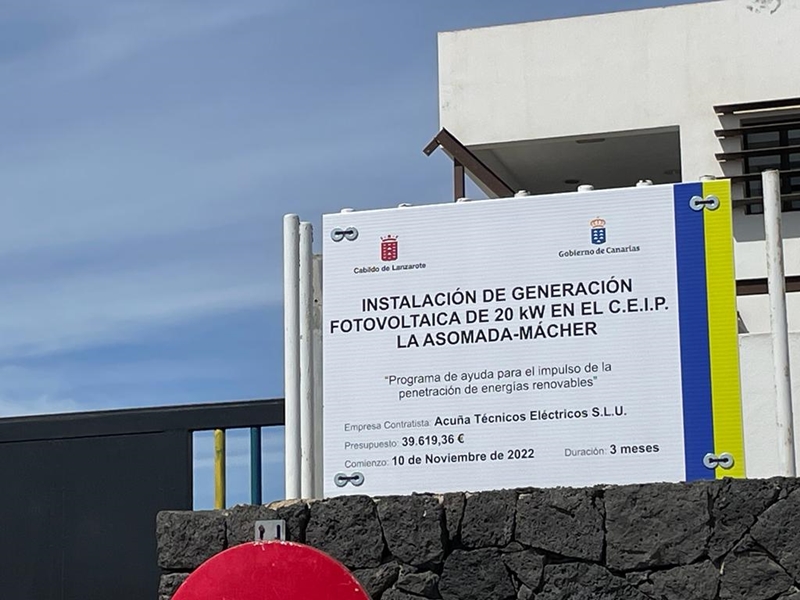 Esta obra consistente en la instalación de tres placas fotovoltaicas de autoconsumo y generación, en la cubierta de sede de la Casa Consistorial, de autoconsumo planta fotovoltaica de 18 kW con un presupuesto de 26.652,63 euros; en las cubiertas del CEIP La Asomada-Mácher de generación fotovoltaica de 20 kW con un presupuesto de 39.619,36 euros; y en la cubierta del Centro de Mayores de Puerto del Carmen, de autoconsumo planta fotovoltaica de 10 kW con un presupuesto de 18.383,52 euros, ascendiendo la inversión a un total de 84.655,41 euros.