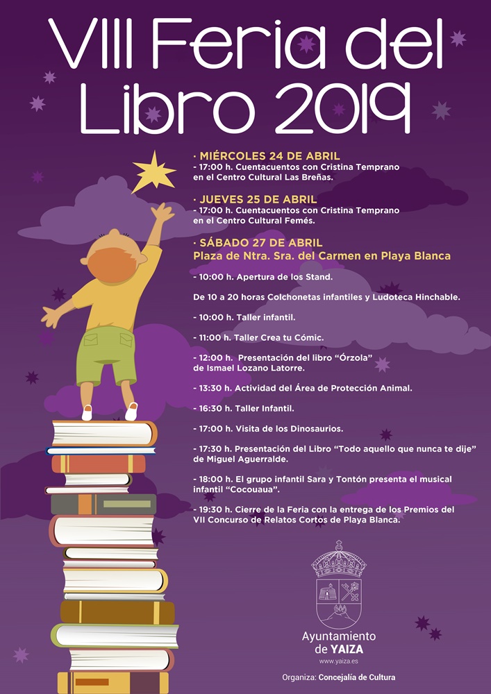 El municipio de Yaiza invita a la Feria del Libro que celebra la localidad turística de Playa Blanca este sábado 27 de abril en la Plaza del Carmen con un variado programa que mezcla literatura, talleres, juegos y actuaciones escénicas, todo un día para conocer nuevos títulos, repasar clásicos, hablar con escritores y disfrutar en familia de las actividades que dinamizan este octavo encuentro con las letras en el sur de Lanzarote de 10:00 a 19:30 horas. El alcalde de Yaiza, Óscar Noda, anima a la participación recordando que el programa completo puede consultarse en portada de www.yaiza.es.