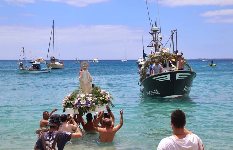 Si ya era notoria la participación en la procesión terrestre, el gentío en la playa y la avenida marítima fue impresionante. Pescadores retirados y familias marineras de toda la vida llevaron en hombros a la Virgen hasta su embarcación. Allí estuvieron vecinas como Senda Martín, Omaira Umpiérrez y Sandra Caraballo al pie de su figura para entregarla a orillas del mar al patrón mayor de la Cofradía de Pescadores de Playa Blanca, Cristo Caraballo, y un grupo de vecinos del pueblo que la cargaron en hombros hasta el barco Nuevo Santo Domingo.