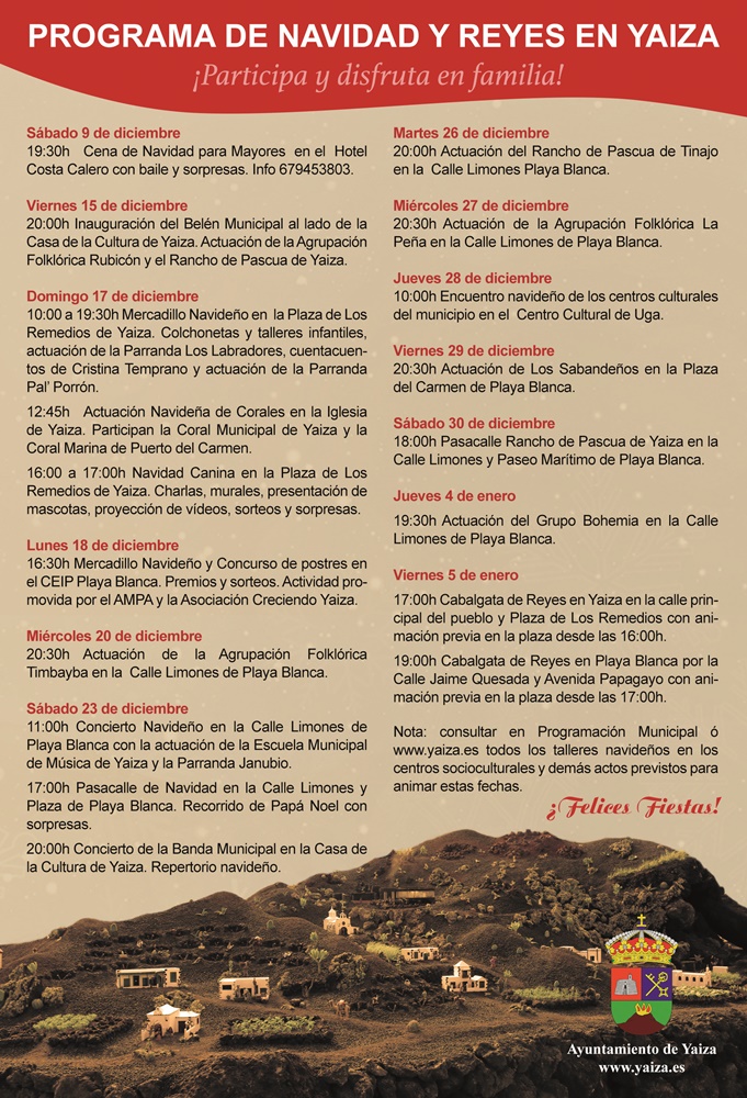La música se encargará de ir ambientando la víspera de Nochebuena desde por la mañana, con el Concierto Navideño que ofrecerán la Escuela Municipal de Música de Yaiza y la Parranda Janubio a las 11.00 horas en la calle Limones, así como de cerrarla, ya que a las 20.00 horas del mismo 23 de diciembre la Banda Municipal actuará en la Casa Benito Pérez Armas de Yaiza.