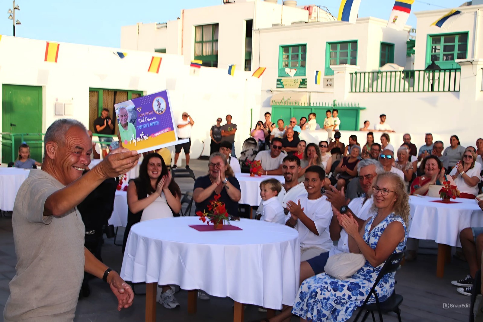 ¿Quién no conoce en Playa Blanca a Aquilino Martín de Ganzo?, es difícil que alguien levante el brazo. Vecino del Sur y querido por propios y extraños, Aqui recibió este lunes, víspera del Día Grande de la Virgen del Carmen, todo el cariño que el pueblo le profesa en la calle en un sentido homenaje participado por su madre Elena y familiares cercanos, familias de la localidad sureña, miembros de la comisión de fiestas, representantes públicos de Yaiza y vecinos y vecinas que siendo oriundos de otros municipios y regiones también lo reconocen como una figura imprescindible del pueblo y gran corazón.