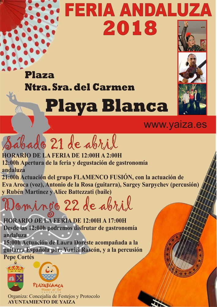 El sábado 21 sube a tarima, a las 21:00 horas, el grupo Flamenco Fusión con la actuación de la cantante Eva Aroca, Antonio de la Rosa (guitarra), Sargey Sarpychev (percusión) y Rubén Martínez y Alice Battezzati (baile). La fiesta en todo caso comienza el sábado a partir de las 12:00 horas del medio día, horario de apertura que se mantiene para el domingo 22 de abril. Este último día actúa, a las 15:00 horas, Laura Doreste, acompañada en la guitarra española por Yuniel Rascón y Pepe Corté en la percusión. El concejal de Festejos de Yaiza, Javier Camacho, anima a la participación.