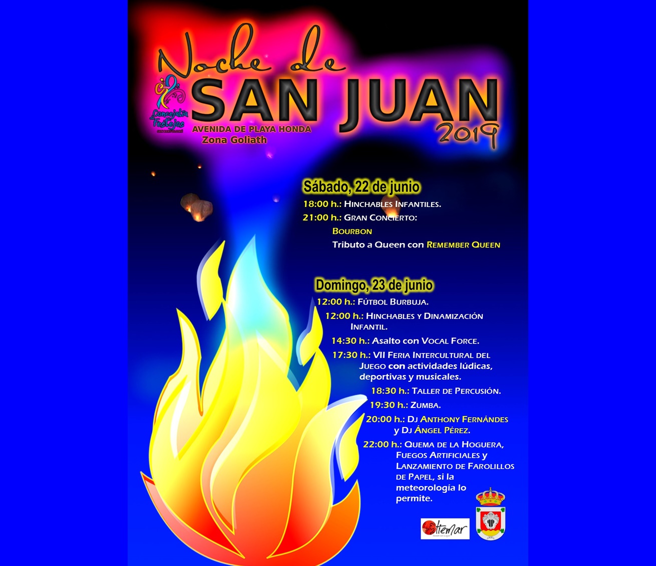 Los actos del día 22 de junio corren a cargo de la concejalía de festejos contando con una noche en la que la música será la gran protagonista dando comienzo la velada con los lanzaroteños Bourbon seguido del Gran Concierto Tributo “Remember Queen” y los actos del día 23 de junio se realizan conjuntamente entre el Ayuntamiento de San Bartolomé y el ICI, con una amplia programación para promover la diversidad, relaciones, espacios de encuentro y juegos, enmarcado todo dentro de la VII Feria Intercultural del Juego San Juan (Proceso Comunitario de San Bartolomé). Todos los actos se celebrarán en la Avenida de Playa Honda, zona Goliath.