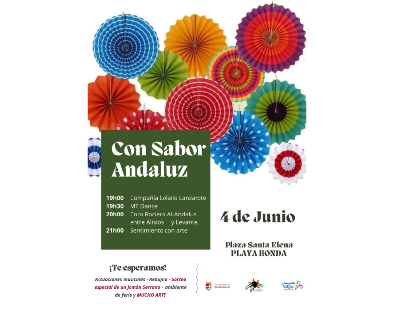 El sábado día 4 de junio, a partir de las 19.00 horas, la Plaza Santa Elena de Playa Honda acogerá fiesta con sabor andaluz, organizada por la Asociación Al-Andalus entre Alisios en colaboración con la concejalía de Festejos.