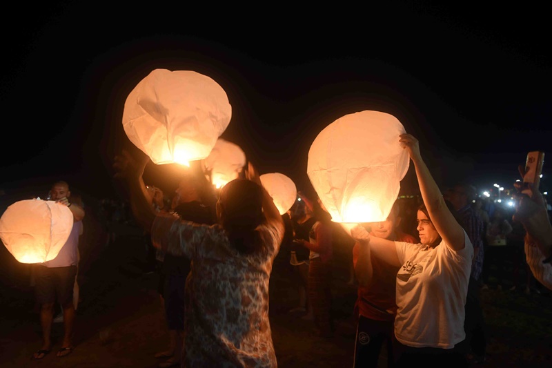 El cielo brilló en esta especial noche con farolillos de papel y fuegos artificiales.