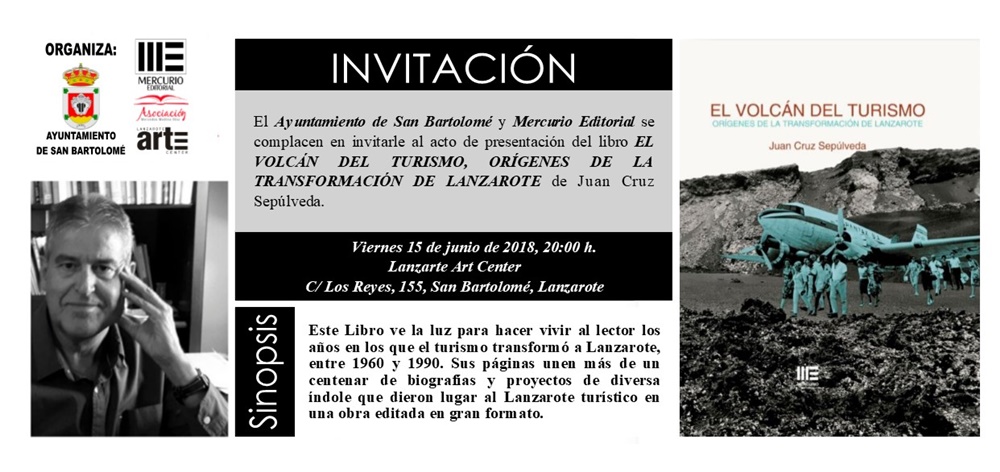 Presentación el viernes día 15 de junio a las 20.00 horas, del libro "El Volcán del Turismo, orígenes de la transformación de Lanzarote" de Juan Cruz Sepúlveda, en Lanzarote Art Center, ubicada en la calle Los Reyes nº 155 de San Bartolomé, organizado por el Ayuntamiento de San Bartolomé a través de la concejalía de turismo delegada en Isabel Sosa y Mercurio Editorial en colaboración Lanzarote Art Center.