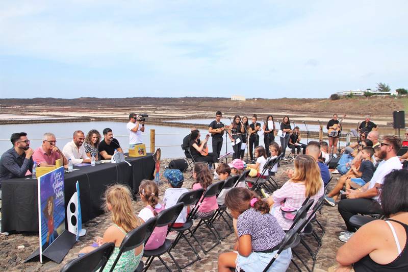 Niños y niñas de La Escuela Municipal de Música, dirigida por Clotildo Martín, animaron el acto de presentación del libro cantando coplas de Víctor Fernández Gopar. Laura Escuela, autora de los textos junto a Diego G. Reinfield, apuntaba encantada que "he estado hablando con una persona que ha trabajado en Las Salinas hace muchos años, y que le dedicaba el libro a su nieta, y la verdad es que es una preciosidad el poder acompañar a la infancia a través de la literatura".