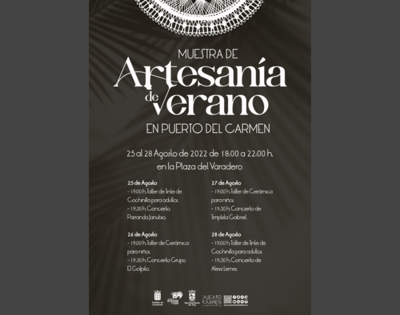 El Ayuntamiento de Tías, gobernado por PSOE, Lanzarote Avanza y Podemos Tías, ha impulsado la celebración de la Muestra de Artesanía de Verano en Puerto del Carmen, que tendrá lugar del 25 al 28 de agosto, de 18 a 22 horas, con la participación de 45 artesanos. Esta muestra cuenta con la colaboración de la Consejería de Artesanía y Comercio del Cabildo de Lanzarote.