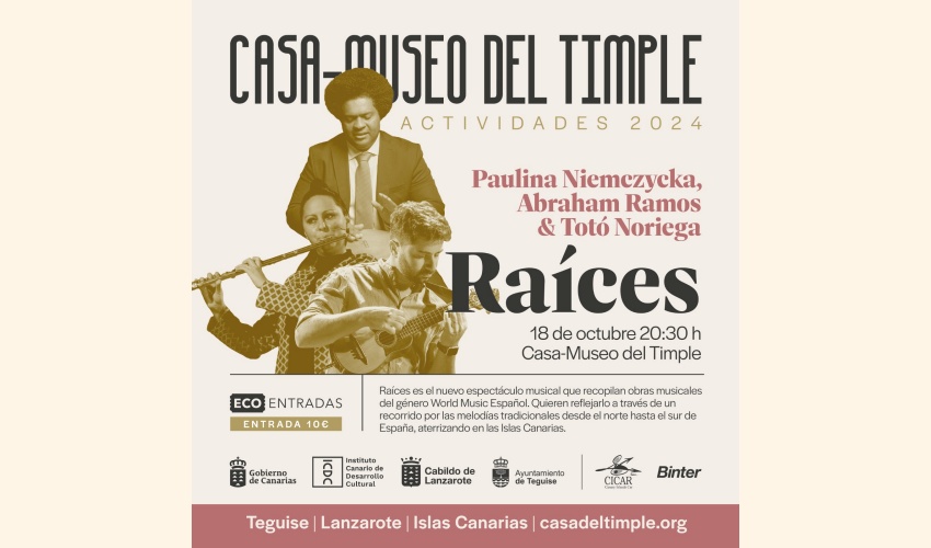 La Casa-Museo del Timple continúa con su programación cultural con la presentación de Raíces, un espectáculo musical que recopila obras del género World Music Español. El evento se celebrará este viernes, 18 de octubre, a las 20:30 horas, y contará con la actuación de Paulina Niemczycka, Abraham Ramos y Totó Noriega