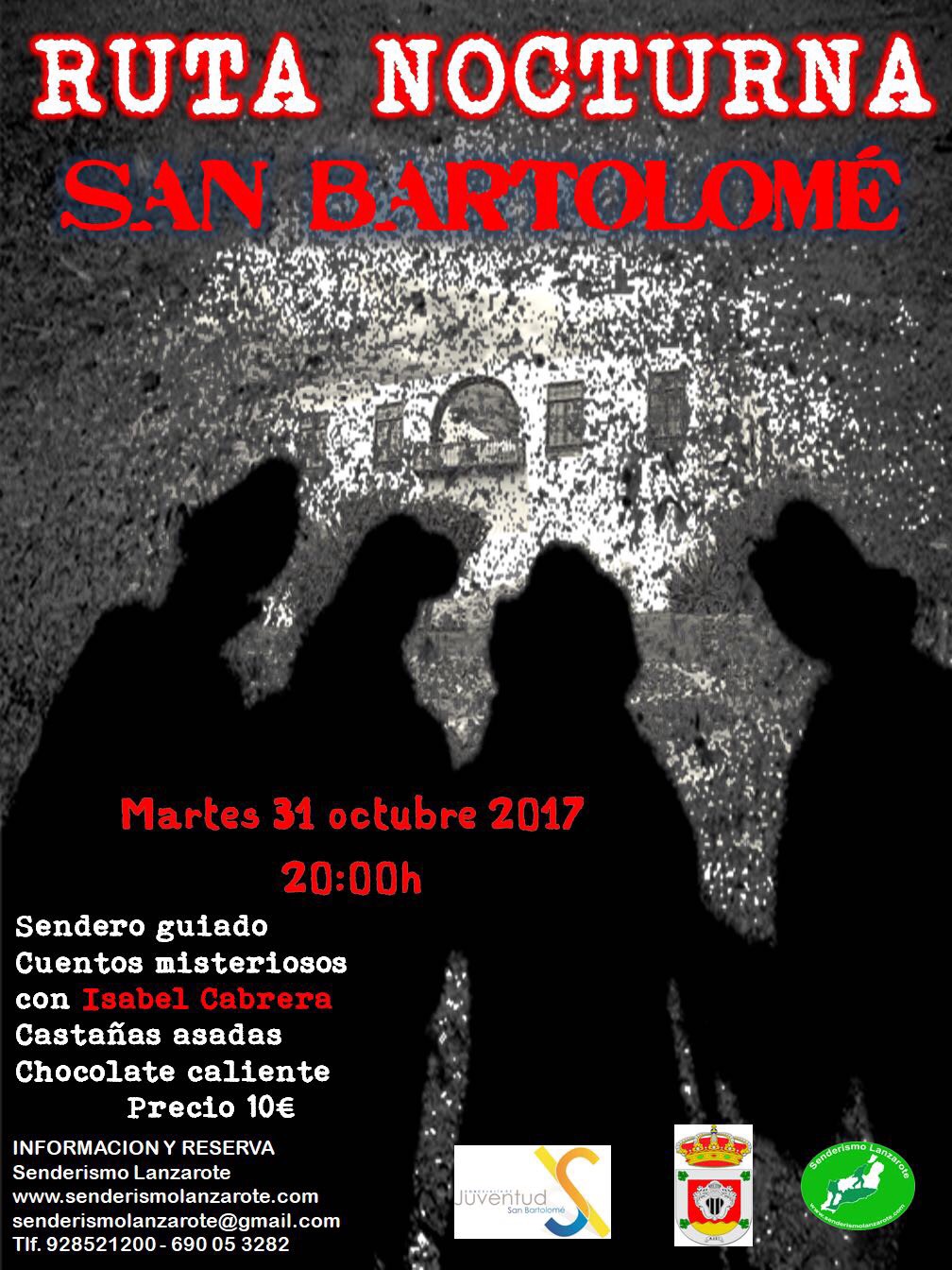 La concejalía de Juventud del Ayuntamiento de San Bartolomé en colaboración con Senderismo Lanzarote, coincidiendo con la noche previa a la celebración del día de todos los santos, organizan una ruta de senderismo por el casco de San Bartolomé, que incluye narración de cuentos misteriosos a cargo de Isabel Cabrera. Será la noche del 31 de octubre, con salida a partir de las 20.00 horas desde la Casa Mayor Guerra.