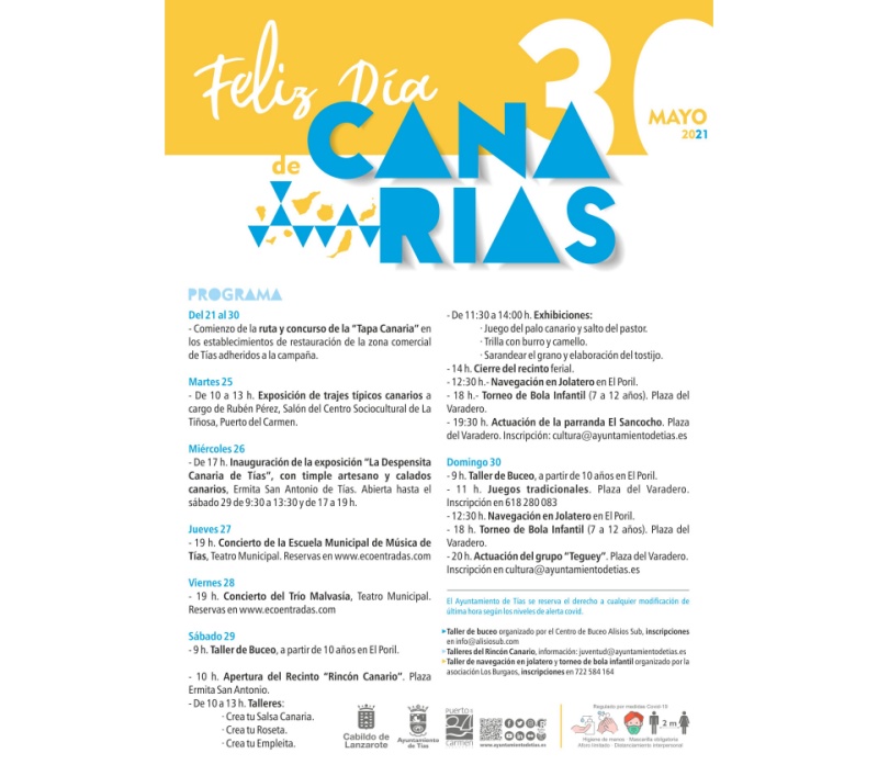 Con la implicación de las concejalías de Comercio, Cultura, Juventud y Fiestas, los actos se inician el día 21 con la ruta y concurso de la tapa canaria en Tías, que se prolongará hasta el 30 de mayo, Día de Canarias. El día 25 se inaugurará una exposición de trajes típicos canarios en el centro sociocultural de Puerto del Carmen y el día 26 se inaugurará la exposición "La despensita canaria de Tías", con timple artesano y calados canarios en la ermita de San Antonio.