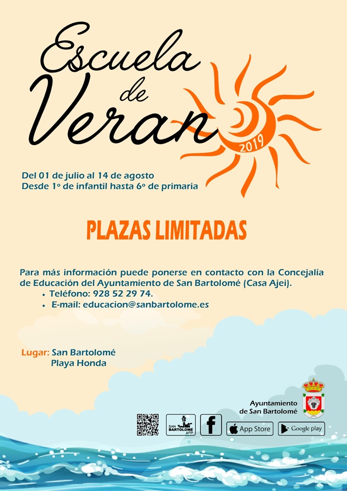 El Ayuntamiento de San Bartolomé informa a todos los interesados/as que el plazo de inscripción en para niños y niñas en la Escuela de Verano, organizada por el área de educación, está abierto desde el 6 de junio, y que el número de plazas es limitado.