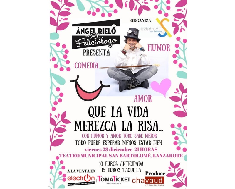 La concejalía de juventud del Ayuntamiento de San Bartolomé anima a la ciudadanía a conocer de primera mano en el Teatro Municipal una interesante propuesta de humor, comedia, amor, con la puesta en escena del espectáculo del actor, locutor, presentador, cómico y feliciólogo Ángel Rielo ‘Que la vida merezca la pena’, en formato monólogo.